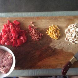 1. First dice the tomatoes and the fresh meat., slice the fish rolls, dice the ham sausage, and prepare an appropriate amount of corn kernels
