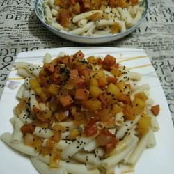 8.Put a little into the preheated pot oil, sauté the onion and garlic until fragrant, then pour in the other prepared ingredients: diced tomatoes, diced onions, diced ham, and diced potatoes.Add them one by one and stir-fry evenly.Then add an appropriate amount of soy sauce, tomato sauce, and black pepper and stir-fry.Add an appropriate amount of filtered purified water, cover the pot and cook.Because I use the Amway Queen Pot, it cooks faster and tastes better than the ordinary pot, because the Queen Pot can retain the original moisture of the ingredients!