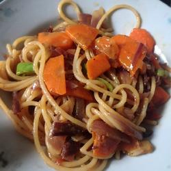 3. Stir-fry, first stir-fry onions, when fragrant add carrots, ham, sausage, ginger, stir-fry for 6-7 seconds, add chili beef, add tomatoes and stir-fry, after the juice is released, add a little water to boil, add salt, mix well and add noodles...add black pepper juice before serving.Mix well.The beef should not be fried too old.It is a matter of personal preference.I like the beef to be fried with onions if it is older, and if I like the beef to be sour, add some tomato sauce
