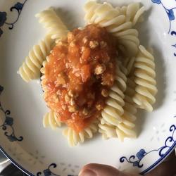 10. Spiral noodles are difficult to soften, so I cooked them under cold water, boiled the water for a while, then added cold water and then cooked the noodles.The noodles can be cooked with the sauce for the baby to eat.I cooked them until they were softer, took them out and poured them in.Sauce, stir and serve! Lee Kum Kee's tomato juice is on the sweet side, so the sauce is slightly sweet.There are also salty flavors on the market, but I personally don't like them