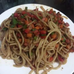 6. Add the drained pasta and stir-fry quickly.Stir well and serve.During the stir-frying process, pay attention to the heat and the texture of the vegetables.The peppers should be kept light and refreshing, without excessive stir-frying.