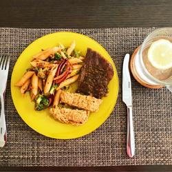 Pork dumpling ( a small bowl (available in supermarkets) ) | Rooster brand red pepper flavored Italian sauce ( 1 small bottle ) |