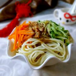 9. Put cucumber shreds and watered carrots on top of the noodles.