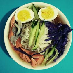 Noodles, cucumbers, eggs, seaweed, mushrooms, purple cabbage ( Moderate ) | Two star anise, a pinch of Sichuan peppercorns, sesame oil, white vinegar, light soy sauce, salt ( appropriate amount ) |