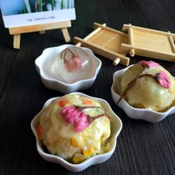 1.Soak the cherry blossoms in cold water and use chopsticks to gently open the flowers.2.Stir-fry the diced vegetables until cooked, add rice and eggs and stir-fry together.3.Heat the cheese in the microwave until it melts.Do not chew it for too long.