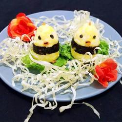 6.Use seaweed to make the chicken’s clothes and feet, and carrots to make the eyes and nose.(Cut with kitchen scissors)