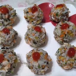 Rice (a bowl) | Seaweed, shrimp, carrot, yellow pepper, Green vegetables, sesame seeds (appropriate amount, add up to half a bowl ) |