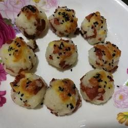 2. Form into a small ball and put cheese on top and garnish with black sesame seeds.