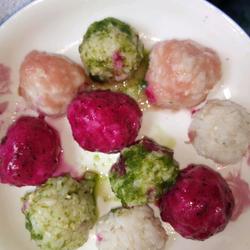 3.Put the cooked rice and meat Add a little salt and knead into a ball.Put the beaten juice into each and soak for a while