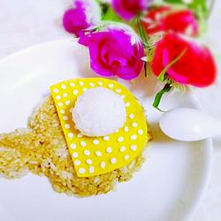 9.Put the egg yolk on top of the rice and trim it into a semicircle