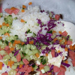 3. Pour out the cooked rice and let it cool down.Add all the ingredients to the rice and mix well