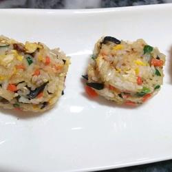 3.Heat a pan and add some oil, then add onions, carrots and green peppers and stir-fry, then add eggs, mushrooms, then add rice, mince chives, add a little salt, soy sauce, chicken essence, Then after frying, use the rice ball mold to press out the shape and it's OK