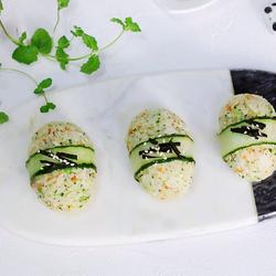 15. Then use a planer to cut the cucumber into strips, and then cut it after making several rice balls.Wrap a few strips in the middle of the dough, put cut seaweed on them, and sprinkle some white sesame seeds for decoration.