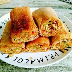 9.Take a pancake and spread it on the cutting board.Put the vegetables you just fried on the pancake.Roll up this side of the dish and set aside.