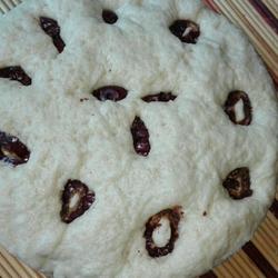 7.Use your hands to form a round cake, press in the dates and put it in the steamer