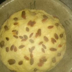 2. Sprinkle the fermented dough with coriander and raisins, and put it into the pot after it has risen.Steam until cooked, add steaming cloth or brush with oil in the basin and put the dough in.