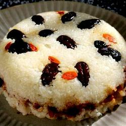 7.Apply a layer of bean paste , add the remaining blackcurrants and wolfberries, cover with glutinous rice, and steam in a steamer for 10 minutes