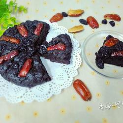 12. Then evenly paste the red date slices and black grapes on the black rice dough.