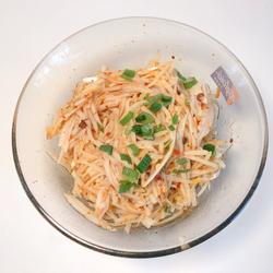 3. Drain the water, add 10 peppercorns, 4g garlic, 5g green onions, 10g chili noodles, pour hot oil, 10g light soy sauce, 10g rice vinegar, 10g sesame oil, 1g of salt, 1g of chicken essence