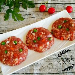 4. Add onions, carrots and green beans to the meat and stir evenly , take an appropriate amount of meat filling and press it into a ball into a meat patty, put it into a plate, and freeze it in the refrigerator