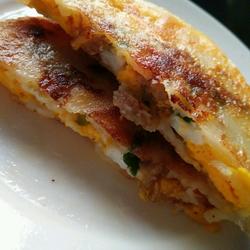7.Put in the fried eggs and fry until the flour slurry is hard, then scoop it out and set aside