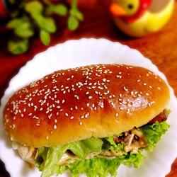 6. After the bread is baked, cut it in the middle and add washed lettuce, beef slices, Sausage, sprinkle with salad dressing!