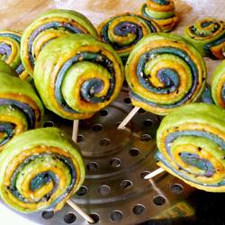 1.Use spinach juice, purple potato puree, pumpkin puree and yeast water diluted with warm milk to knead the dough..Knead into a smooth dough and let rise until doubled in size.