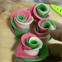 2. Knead the air out of the dough and divide the dough of different colors into small doughs., roll it out like a dumpling wrapper, into groups of five, and then roll it to the end like the picture.