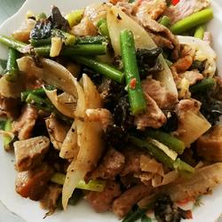 5.Pour oil into the pot, add the remaining onions, ginger and garlic, add onions, garlic sprouts and fungus and stir-fry