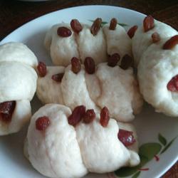 5. Roll the intestines in the dough, as shown in the picture, and put raisins on top.