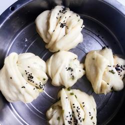 3. Knead the dough for a while, knead out the air inside, and use a rolling pin to drive it out Make a round ball, add oil and green onions, fold it up, cut it into small sections, stack the two together, pinch the two ends and twist them to meet your hands, and sprinkle some black sesame seeds on top.