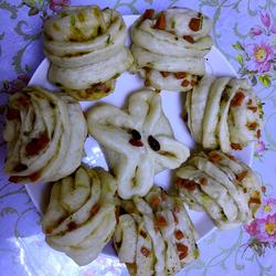 7.Continue to spread the chopped green onion and diced ham evenly on the dough piece