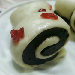 3.Use a rolling pin to flatten the white dough.Apply some oil on the surface.Then flatten the brown dough on it.Roll it into a long strip and cut it into pieces with a knife.Continue to ferment.Wait until doubled in size and steam it in a pot over high heat.