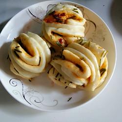 3. Roll out the dough into a rectangular shape, touch it with Lao Gan Ma oil chili pepper, and sprinkle with chives , roll it up, don’t roll it too tightly.