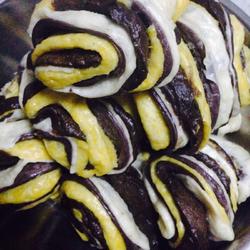 5. First, 150 grams of flour, add chocolate powder, add 2 grams of yeast, add 130g water.Second, add 150 grams of flour, add purple sweet potato starch, add 2 grams of yeast, and add 130 grams of water.Third, add 150 grams of flour, 2 grams of yeast, and 130 grams of pumpkin puree.