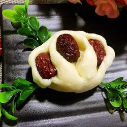 6.Place a red date on each side, pinch it tightly in the middle, and then also put a red date in the middle