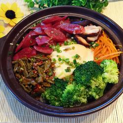 5. Place cooked rice on the bottom of the pot, add sausage slices, broccoli, mushrooms, Spread the hot and sour diced beans on the surface of the rice; beat an egg in the middle.
