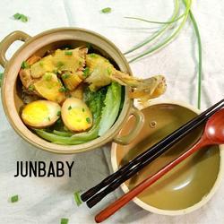 6. Add extra when adding chicken legs, braised eggs, topped with steamed salt baked chicken Cover the pot and simmer for ten minutes