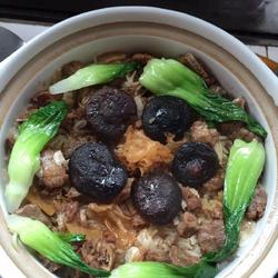 8. Blanch the vegetable hearts with water, open the lid of the pot, and place the vegetable hearts On the surface of the spareribs, the fragrant spareribs claypot rice is ready.