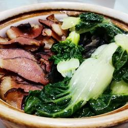 7. When the rice is cooked, evenly spread the bacon and fungus Simmer for 15 minutes, add green broccoli, light soy sauce, oyster sauce, and simmer for five minutes