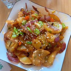 4.Garlic, bean paste, onion, potato, pepper, sauce (Light soy sauce consumes oil and white sugar), chopped green onion, and sesame seeds on a plate.