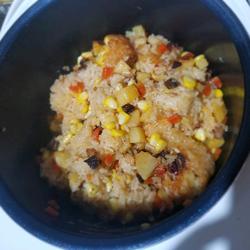 4.Put the glutinous rice on top and then the carrots and corn water just enough to cover the rice