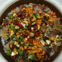 6. Boil the rice until it is almost dry, add the bacon and sausage, cover over low heat for two minutes