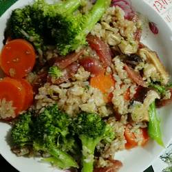 2. Put the soaked rice into the rice cooker and start cooking, (casserole is best ) At this time, prepare other ingredients, slice mushrooms, carrots, sausages, and break broccoli into small florets.