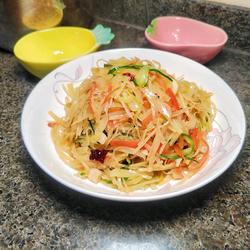 2.Shred the carrots and cucumbers, smash the garlic, and cut the dried peppers into sections