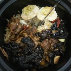 3.Put oil in the wok.When the oil is hot, add chicken legs and fry until they turn yellow.Add light soy sauce, ginger slices, salt, some chili shells according to personal taste, add a little sugar, and add water to simmer., wait until the soup is almost dry, put the chicken on a plate and set aside, put the fungus in the soup for three minutes, put it on a plate and set aside, grease the bottom of the casserole with oil, put the soaked rice into the casserole, add more water than usual Add a little more, and when the water is almost dry, if there are small holes, add chicken, fungus, salted eggs, drizzle with a little juice, and simmer until cooked