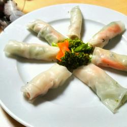 5. Blanch the rice paper with boiling water 3- Take it out in 6 seconds and wrap the stewed chicken and vegetables