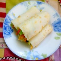 12.Put eggs and three shredded shredded pancakes on the pancake, roll up and serve on a plate