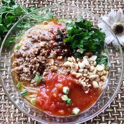 6.Put chopped green onion, light soy sauce and boiling water into the bowl to make soup, then add the boiled rice noodles.Add minced meat, tomato marinade, chopped peanuts, chopped green onions, coriander, and oily chilies.