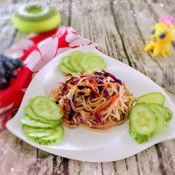 8. Pour in the black fungus and stir-fry.After frying, add all kinds of shredded purple cabbage shred the rice noodles, add salt and oyster sauce to taste, add shredded purple cabbage before serving, and serve on a plate.Cut a few more cucumber slices to garnish.